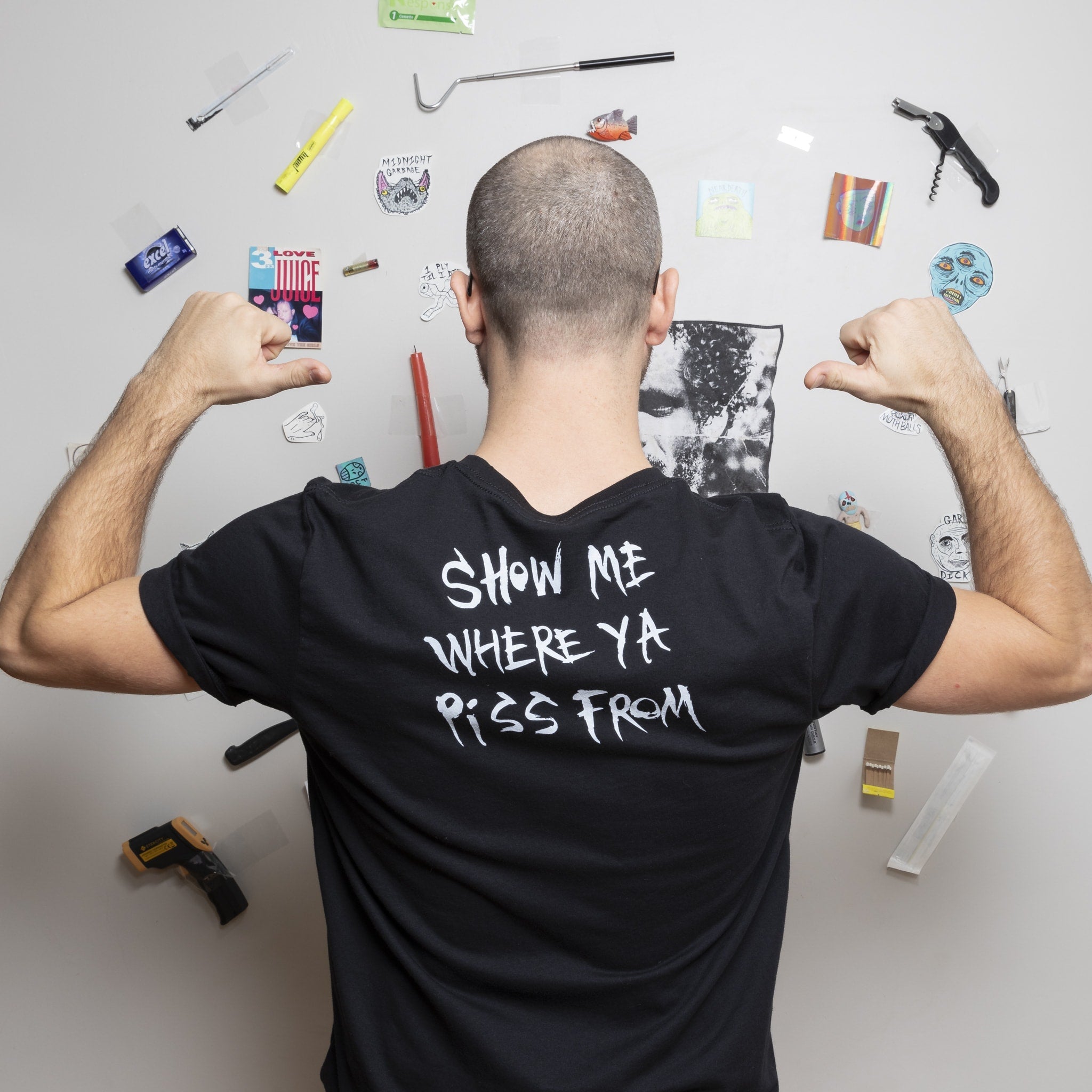 What’s this? What acronym is that?? Suddenly, as you pass parallel to the onlooker, their eyeballs instantly explode from the sheer absurdity of the full back SHOW ME WHERE YA PISS FROM print in ur boi HoiNoi’s signature hand style. perfect for family barbecues and religious services.